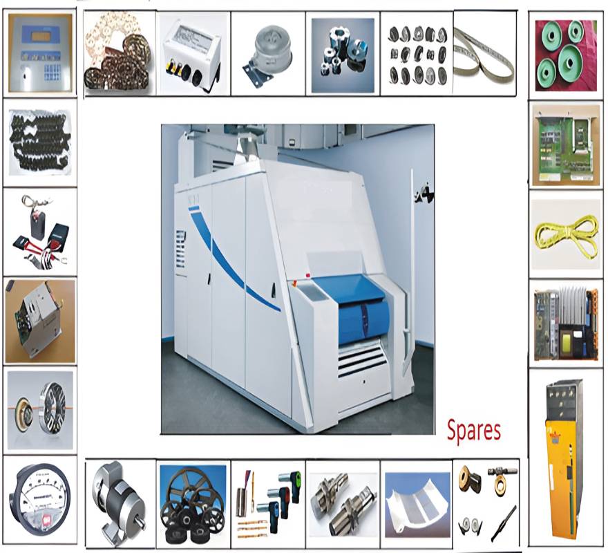 “CVT – 1, CVT – 3, CVT – 4, TV 425, TV 500, TVK 650, Dustex, SF 124, Fine filter, GBR, Bale opener, Axiflow, RK / RV, RSK, B.E, LVSA condensor, SME – scutcher, VT 2, Shaft for fans, Vulkollan strips, Pneumatic valves & cylinders, Spike bars, Conical gear box, Lap spindle, Free wheel clutch, Sensing lever, Worm wheel & worm shafts, Bearing covers, Sprockets, Feed roller, Friction rings, Form roller, Manometer, Wooden lags, Spikes & feed lattice, Photo cell, Sensors, Differential pressure switch, Electronic pressure switches, Magnetic switches & various rubber & nylon spares etc...”